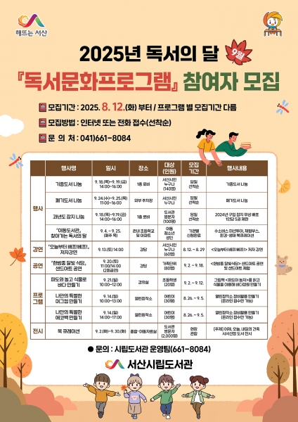 서산시, ‘독서의 달 9월’ 다채로운 독서 문화 프로그램 운영