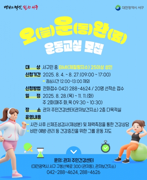 이번 프로그램은 서구 서남부권에 거주하는 성인 가운데 체질량지수 25 이상인 주민을 대상으로 하며 선착순 20명을 모집해 오는 8월 28일부터 11월 11일까지 총 20회에 걸쳐 운영된다.