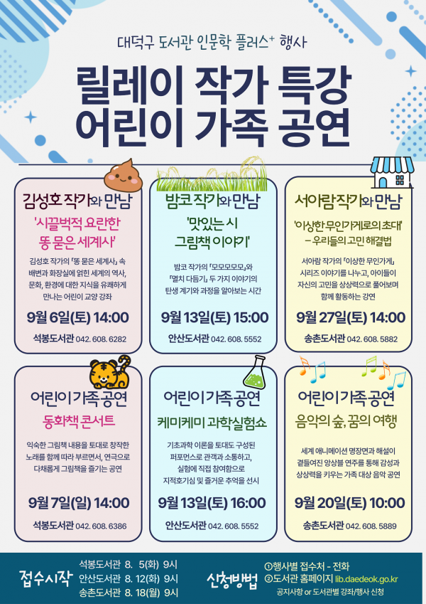 최충규 대덕구청장은 “2025 하반기 도서관 인문학 플러스 프로그램은 어린이부터 가족 단위 이용자까지 누구나 즐길 수 있도록 다채롭고 유익한 콘텐츠로 구성했다”며 “일상 속에서 인문학을 쉽고 자연스럽게 접하고 도서관과 함께하는 독서 활동에도 도움이 되기를 바란다”고 전했다.