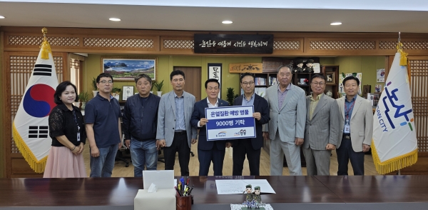 이날 기탁식에는 논산시 100세건강위원회연합회, 공공산후조리원·트리븐아파트 신축공사현장 관계자 등이 참석해 폭염 취약계층을 위한 병물 기탁에 대한 감사의 마음을 전하고 시민 건강을 위한 민관 협력 의지를 다졌다.
