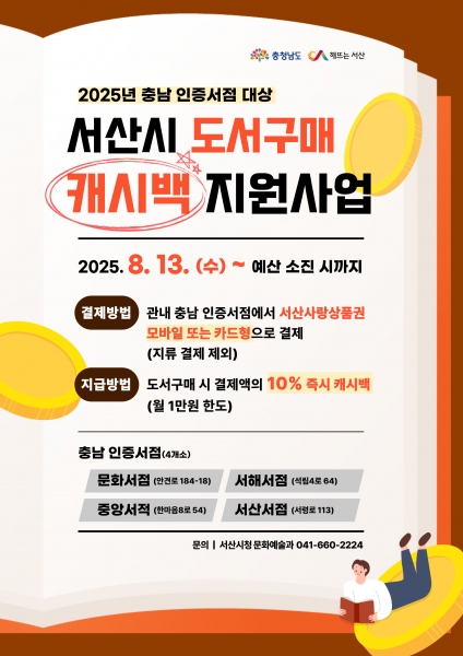 [Ytv영상스토리] 충남 서산시는 오는 13일부터 ‘충남 인증서점 도서구매 캐시백 지원사업’을 시행한다고 밝혔다.