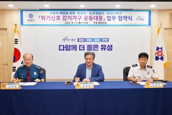 유성구는 유성경찰서·유성소방서와 ‘위기 신호 감지 가구 공동 대응’ 업무 협약을 체결하고 지원 체계 구축 등 고독사 예방을 위한 공동 대응에 나선다고 12일 밝혔다.