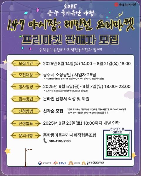 공주 국가유산 야행 147 야시장을 진행하는 중학동마을관리사회적협동조합 정철수 이사장은 “공주 왕도심을 대표하는 행사인 공주 국가유산 야행의 147 야시장: 제민천 프리마켓은 시민과 관광객에게 큰 인기를 받는 프로그램 중 하나”며 “지역 소상공인들이 정성껏 준비한 상품을 소개할 수 있는 절호의 기회인 만큼, 적극적인 참여를 기대한다”고 말했다.