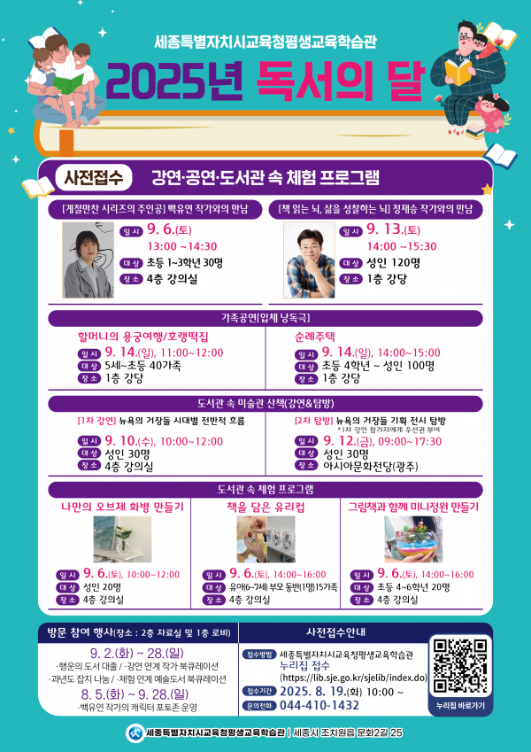 [Ytv영상스토리] 세종시교육청평생교육학습관은 2025년 독서의 달을 맞아 지역 주민의 독서 의욕을 고취하고 독서 문화 진흥에 대한 관심과 참여를 유도하기 위해 다양한 독서문화행사를 운영한다.