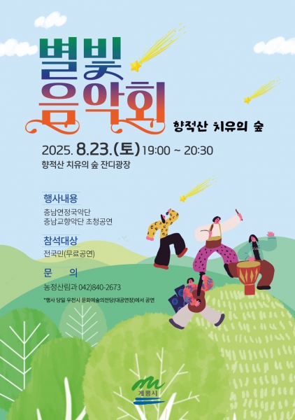 [Ytv영상스토리] 계룡시는 오는 23일 오후 7시부터 8시 30분까지 향적산 치유의 숲 잔디광장에서 ‘향적산 치유의 숲 별빛음악회’를 개최한다고 밝혔다.
