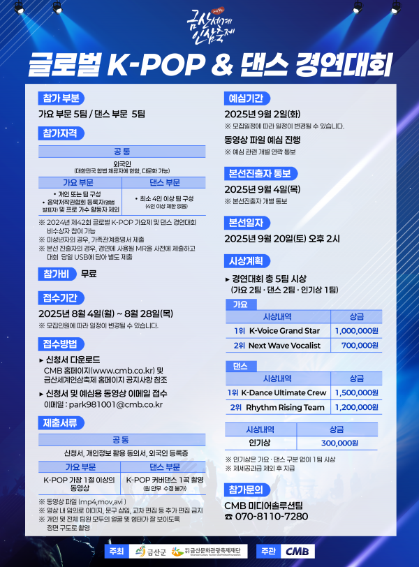 부문별 상금은 △가요 부문 1위 100만원, 2위 70만원 △댄스 부문 1위 150만원, 2위 120만원이다.