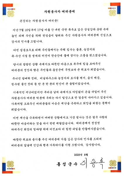 이 군수는 서한을 통해 "폭우로 피해를 입은 우리 군에 따뜻한 손길을 보내주신 여러분의 희생과 헌신 덕분에 주민들이 다시 일어설 용기를 얻고 있다”며 자원봉사 한 분 한 분의 수고와 열정이 우리 지역 사회를 더 따뜻하게 만들었다며 진심으로 감사하다고 밝혔다.