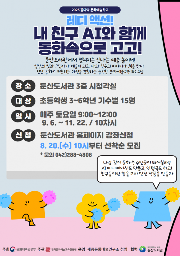 [Ytv영상스토리] 대전 서구 둔산도서관은 문화체육관광부가 주최하고 한국문화예술교육진흥원이 주관하는 ‘꿈다락 문화예술학교’ 공모사업에 선정돼, 오는 9월부터 ‘레디 액션 내 친구 AI와 함께 동화 속으로 고고’ 2기 프로그램을 운영한다.