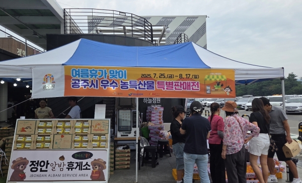 [Ytv영상스토리] 공주시는 여름 휴가철을 맞아 정안알밤휴게소 상·하행선 야외 판매장에서 열린 ‘2025년 여름휴가철 지역 농·특산물 홍보판촉전’ 이 성황리에 마무리됐다고 19일 밝혔다.