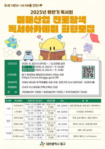 [Ytv영상스토리] 대전 동구는 이달 20일부터 관내 공공도서관 3곳에서 ‘2025년 하반기 독서회 미래산업 진로탐색 독서아카데미’ 회원을 모집한다고 19일 밝혔다.