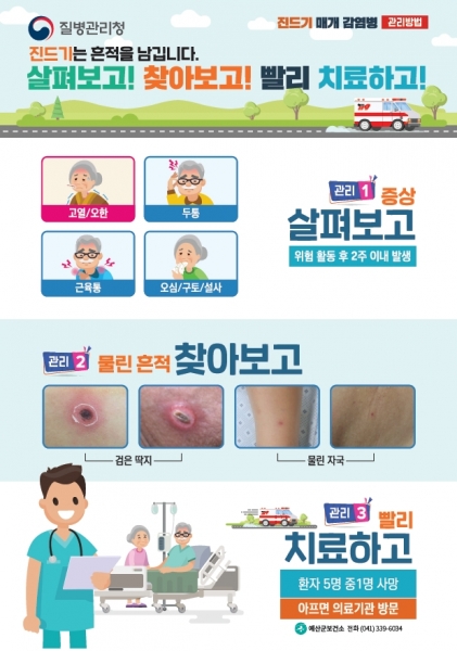 충남도 보건환경연구원의 감시 결과, 매년 5월부터 11월까지가 중증열성혈소판감소증후군, 쯔쯔가무시증, 라임병 등 진드기 매개 감염병이 집중 발생하는 시기이며 최근 고온 다습한 날씨와 농작업·등산·나물채취 등 야외 활동 증가로 감염 위험이 커지고 있다.
