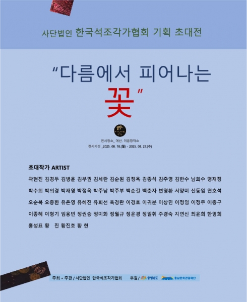 [Ytv영상스토리] 예산군은 사단법인 한국석조각가협회 주관으로 ‘다름에서 피어나는 꽃’ 특별 기획 초대전을 8월 18일부터 27일까지 예산 이음창작소 대전시실에서 개최한다고 밝혔다.