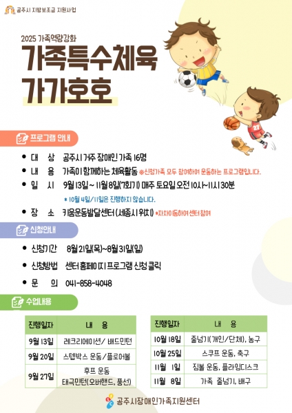공주시장애인가족지원센터, 가족 특수 체육 ‘가가호호’ 참여자 모집