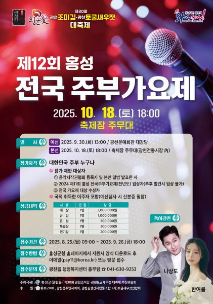 한편 이번 전국 주부가요제는 10월 18일부터 20일까지 열리는 홍성군 대표 특산물 축제인 ‘제30회 광천조미김·광천토굴새우젓 대축제’의 서막을 화려하게 장식할 예정이다.