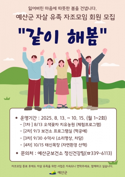 자조모임 ‘같이 해봄’은 군에 거주하는 자살 유족 누구나 참여할 수 있으며 2∼4회차 모임은 9월부터 10월까지 월 1∼2회 운영될 예정이다.