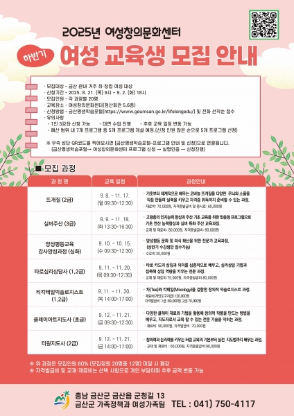 모집 대상은 관내 거주하며 취·창업을 준비하는 여성으로 9월 2일까지 군청 여성가족팀에 전화하거나 금산평생학습포털에 접속해 신청할 수 있다.