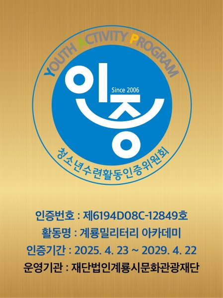 ‘계룡밀리터리 아카데미’ 프로그램은 지난 4월 여성가족부 산하 한국청소년활동진흥원으로부터 청소년수련활동프로그램 인증을 획득하며 정부가 공인한 체험 프로그램으로 자리매김하게 됐다.