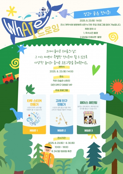 [Ytv영상스토리] 대덕문화관광재단은 오는 23일부터 30일까지 ‘작은미술관 신탄진에서’ AI 융합 디지털 미술교육 프로그램 ‘whAle-I 드로잉’ 성과전시회를 개최한다고 밝혔다.