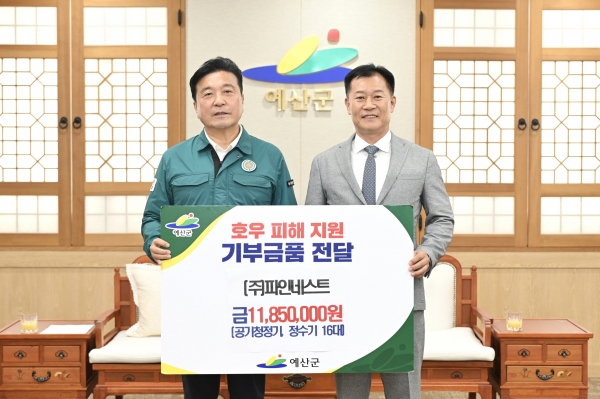 [Ytv영상스토리] 예산군은 ㈜파인네스트로부터 집중호우 피해로 어려움을 겪고 있는 이재민들을 위해 1000만원 상당의 정수기와 공기청정기 총 16대를 기탁받았다고 22일 밝혔다.