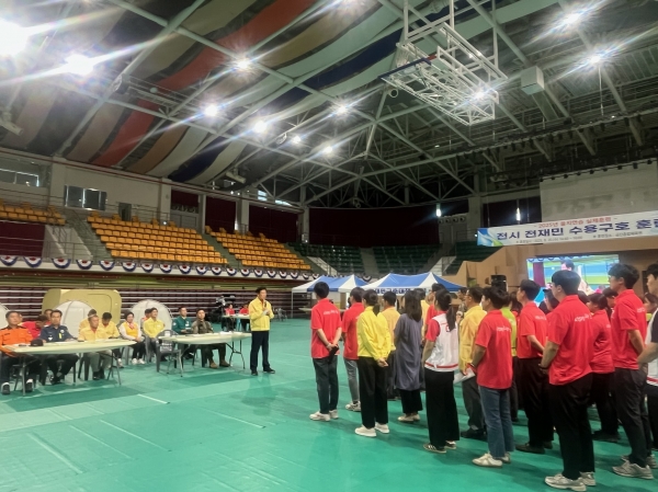 지난 20일에는 금산군종합체육관에서 실제 훈련으로 전재민 수용 구호 훈련을 시행했다.
