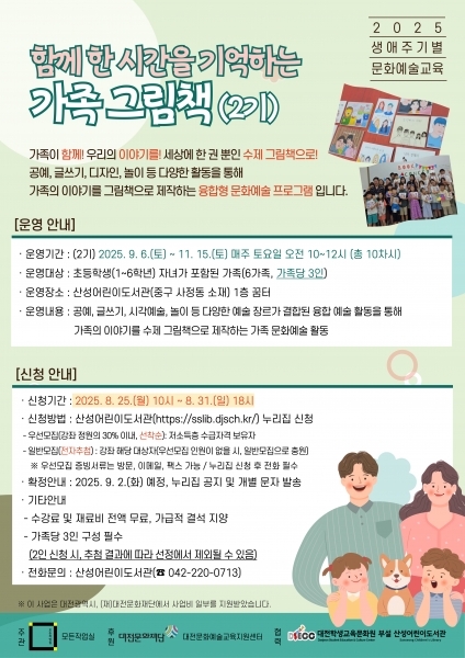 [Ytv영상스토리] 대전학생교육문화원 부설 산성어린이도서관은 건강한 가족 문화 조성을 위해 2025년 생애주기별 문화예술교육 ‘함께 한 시간을 기억하는 가족 그림책’ 2기를 9월부터 세 달간 운영한다고 밝혔다.