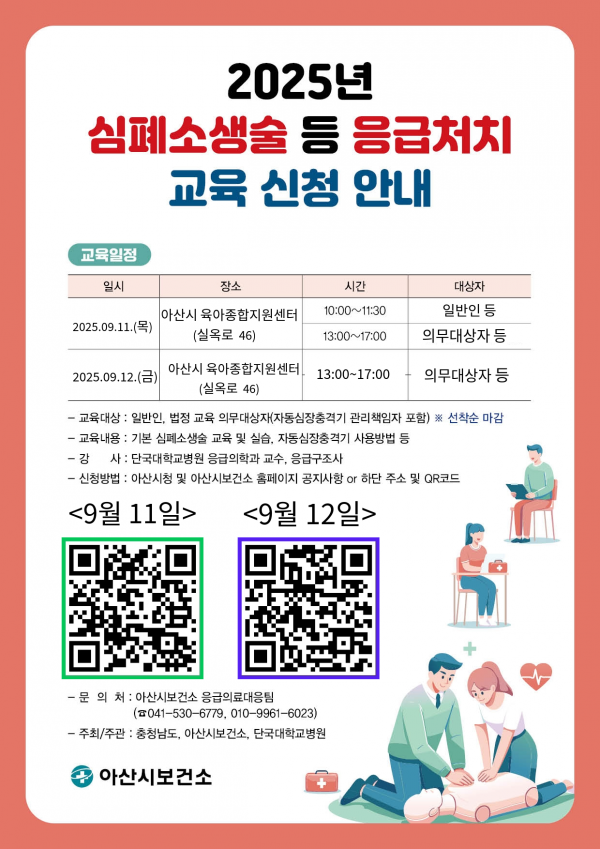 교육장소는 아산시 육아종합지원센터 3층 대강당이며 신청은 아산시청 및 아산시보건소 홈페이지 공지사항 ‘9월 심폐소생술 등 응급처치 교육’에서 가능하다.