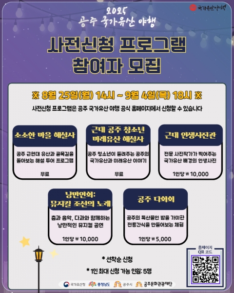 사전신청 프로그램은 모두 온라인 사전신청을 통해 모집하며 공주 국가유산 야행 홈페이지에서 신청할 수 있다.