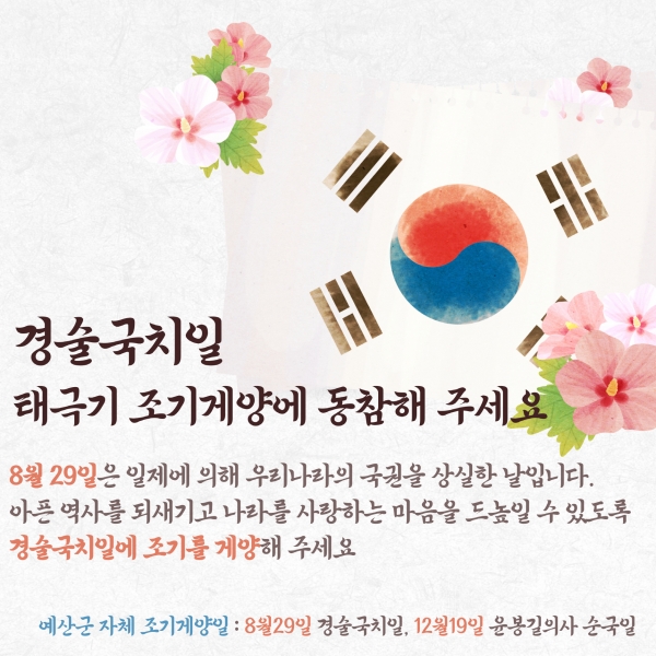 군 관계자는 “경술국치라는 뼈아픈 역사를 잊지 않도록 결의를 다지는 가운데 각 기관·단체, 가정 등 군민 여러분의 적극적인 동참을 부탁드린다”고 당부했다.