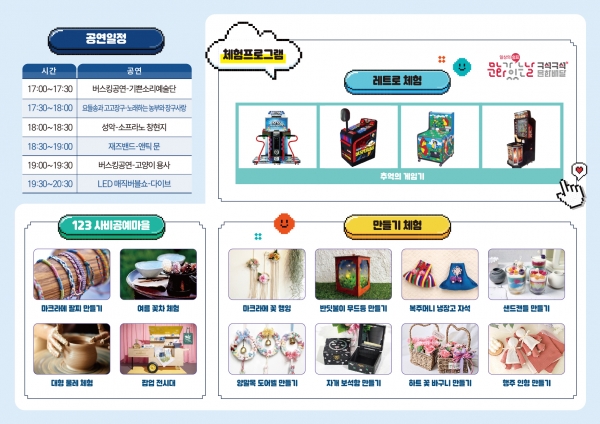 ‘레트로 체험’ 코너에서는 △추억의 게임기 체험이 준비되어 있고 ‘123 사비공예마을’과 ‘만들기 체험’ 부스에서는 △마크라메 팔찌 만들기 △여름 꽃차 체험 △대형 물레 체험 △마크라메 꽃 행잉 △반딧불이 무드등 만들기 △복주머니 냉장고 자석 △샌드캔들 만들기 △자개 보석함 만들기 △하트 꽃바구니 만들기 △행주 인형 만들기 등 가족 단위 방문객이 즐길 수 있는 다양한 체험이 준비되어 있다.