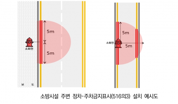 이번 사업은 ‘도로교통법’에 따라 소방시설 반경 5m 이내 구간에 노면을 적색으로 칠하고 ‘소방시설 주·정차 금지’ 안내 문구를 표기하는 방식으로 추진된다.