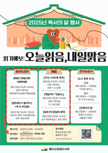 [Ytv영상스토리] 예산군 공공도서관은 독서의 달을 맞아 예산 군민을 대상으로 오는 9월 2일부터 9월 30일까지 독서의 달 행사를 운영한다.