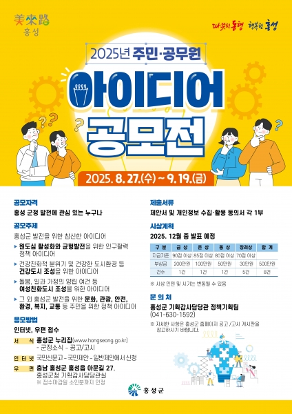 공모의 소주제로는 △원도심 활성화와 균형발전을 위한 인구활력 정책 아이디어 △건강 친화적 분위기 및 건강한 도시환경 등 건강도시 조성을 위한 아이디어 △돌봄, 일과 가정의 양립 여건 조성 여성친화도시 조성을 위한 아이디어 그 밖에 홍성군 발전을 위한 문화, 관광, 안전, 환경, 복지, 교통 등 주민을 위한 정책 아이디어도 자유롭게 응모 가능하다.