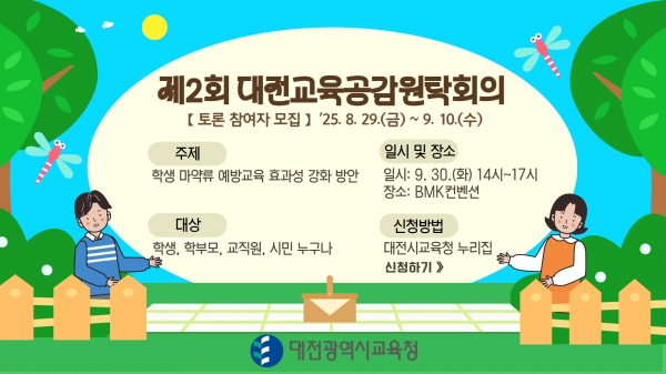 [Ytv영상스토리] 대전시교육청은 9월 30일 오후 2시 BMK컨벤션에서 ‘학생 마약류 예방교육 효과성 강화 방안’ 이라는 주제로‘2025년 제2회 대전교육공감원탁회의’를 개최할 예정이며 토론회에 참여할 토론자를 모집한다고 밝혔다.