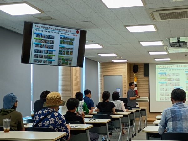 정 박사는 강연에서 병해충 방제 과정에서 화학농약 사용을 최소화하고 해충을 잡아먹는 포식성이리응애 등 천적을 효과적으로 활용하는 방법을 설명했으며 국내외 성공 사례와 함께 기후변화 시대에 맞는 지속가능 농업 모델을 제시하며 환경농업의 경쟁력 강화 방안을 제안했다.