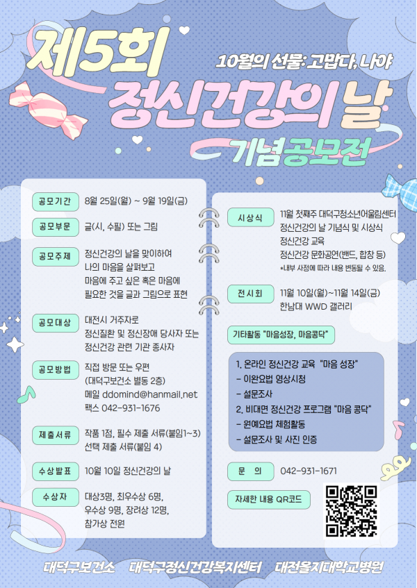 최충규 대덕구청장은 “정신건강은 나 자신을 지키는 힘이자, 지역사회의 행복을 만드는 토대”며 “이번 공모전을 통해 서로의 마음을 나누고 위로하는 장이 되길 바란다”고 말했다