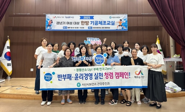 한편 지난 8월 27일 진행된 한방 기공체조 교실에서 참여자들과 서산시 건강증진과 직원들은 ‘청렴 서산’ 실현 의지를 다지는 캠페인을 전개했다.