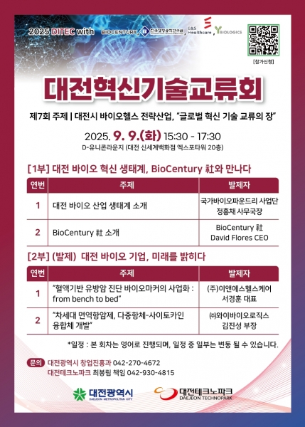 최원혁 대전시 기업지원국장은 “대전의 바이오산업 창업생태계는 올해 5월 글로벌 스타트업 생태계 연구기관 ‘스타트업 블링크’ 가 세계 81위로 평가했을 만큼 경쟁력을 인정받고 있다”며 “대전 바이오 생태계와 글로벌 동향에 관심 있는 분들이 많이 참여해 유익한 정보를 얻어가길 바란다”고 말했다.