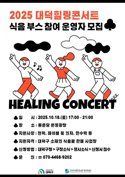 최충규 대덕문화관광재단 이사장은 “대덕힐링콘서트는 문화예술과 일상을 잇는 구민 중심 축제”며 “지역민이 함께 만들어가는 부스 운영을 통해 구민들에게 더 큰 즐거움과 만족을 드릴 수 있기를 기대한다”고 말했다.