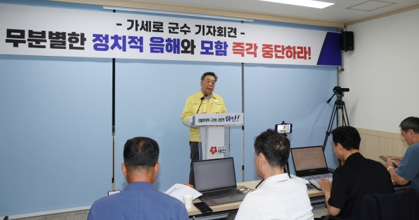 가 군수는 지난 4일 군청 브리핑실에서 기자회견을 열고 “군수 개인을 향한 근거 없는 의혹 제기와 반복적인 음해성 민원은 결국 군민을 위한 군정을 방해하고 지역 발전을 저해할뿐 아니라 그 피해는 고스란히 군민들에게 돌아간다”고 꼬집었다.