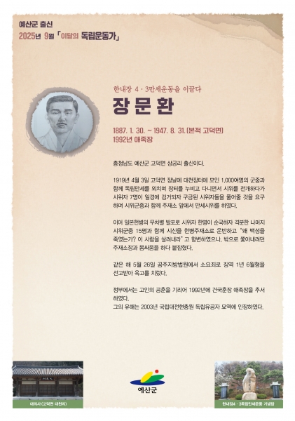 예산군, 2025년 9월 이달의 독립운동가 고덕면 ‘장문환’ 선정
