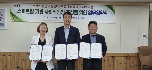 [Ytv영상스토리] 논산시농업기술센터는 9일 푸르메소셜팜, ㈜또로롱과 함께 발달장애인의 안정적 고용과 자립 지원, 농업 일자리 확대를 위한 3자 업무협약을 체결했다.