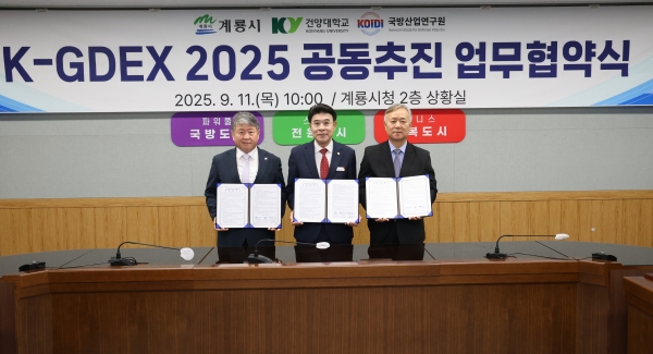 [Ytv영상스토리] 계룡시·건양대학교·국방산업연구원은 11일 계룡시청 상황실에서 오는 18일부터 19일까지 유동리 종합문화체육공원에서 개최되는 ‘K-GDEX 2025, 계룡방산전시회’의 성공적인 추진을 위해 공동 업무협약을 체결하고 본격적인 준비에 돌입했다.