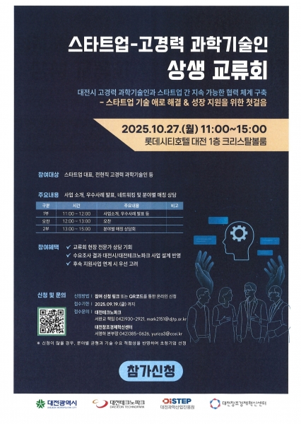 대전시가 지역 스타트업의 기술 애로 해결과 혁신 생태계 강화를 위해‘스타트업 고경력 과학기술인 상생 교류회’를 오는 10월 27일 오전 11시 롯데시티호텔에서 개최한다.