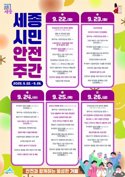 또 15일부터 세종시 누리집, 사회관계망서비스, 버스정보시스템, 전광판, 홍보물 등을 통해 시민안전주간 집중 홍보를 펼칠 예정이다.