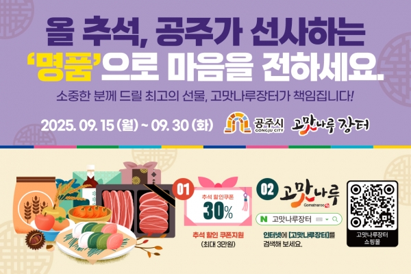 안영희 농식품유통과장은 “민족 최대 명절인 추석을 맞아 시민과 소비자 여러분께 감사의 마음을 전하고자 이번 특별 기획전을 마련했다”며 “공주시에서 정성껏 준비한 농특산물이 널리 사랑받고 소중한 분들께 마음을 전하는 따뜻한 선물이 되길 바란다”고 말했다.