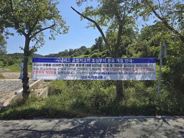 시는 사업 구역 내 분묘 연고자의 피해 최소화를 위해 홍보 현수막 게첨 등을 통해 지속해서 홍보하고 있다 김태종 대중교통과장은 “분묘 연고자 연락 없을 시 무연분묘로 간주해 개장을 실시할 예정으로 잔여 분묘 연고자는 반드시 다음 달 17일까지 연락해 주시기를 바란다”며 “앞으로도 남부권 시내버스 공영차고지의 성공적인 조성을 위해 최선을 다하겠다”고 말했다.