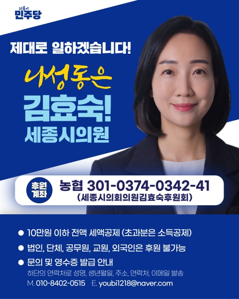 15일 김효숙 부의장에 따르면, 지난해 7월 정치자금법 개정 시행에 따라 지방 광역·기초의원의 후원회 설립이 가능해졌고 이에 김 부의장은 20명의 세종시의원 중 최초로 최근 세종선거관리위원회에 후원회 등록을 마쳤다.