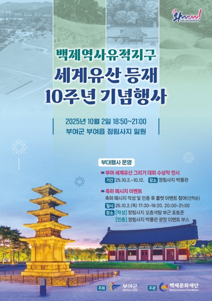 군 관계자는 “세계유산 등재 10주년의 기쁨을 함께 나누고 백제역사유적지구의 가치를 재조명하는 뜻깊은 행사가 되도록 열심히 준비하겠다”며 “세계유산 도시 부여의 탄생 10주년인 만큼 많은 사람들의 관심과 참여를 부탁드린다”고 말했다.