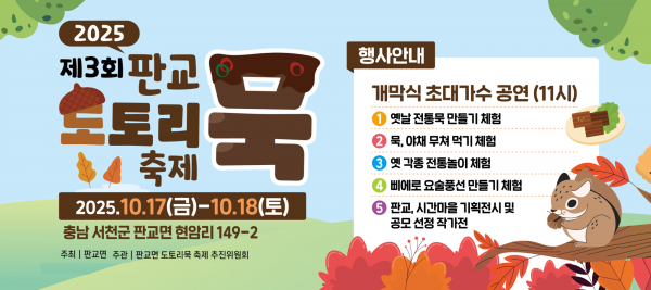 올해로 세 번째를 맞는 이번 축제는 지역 특산품인 도토리묵을 주제로 한 다양한 프로그램이 마련돼 주민과 방문객들에게 즐거운 가을 추억을 선사할 예정이다.