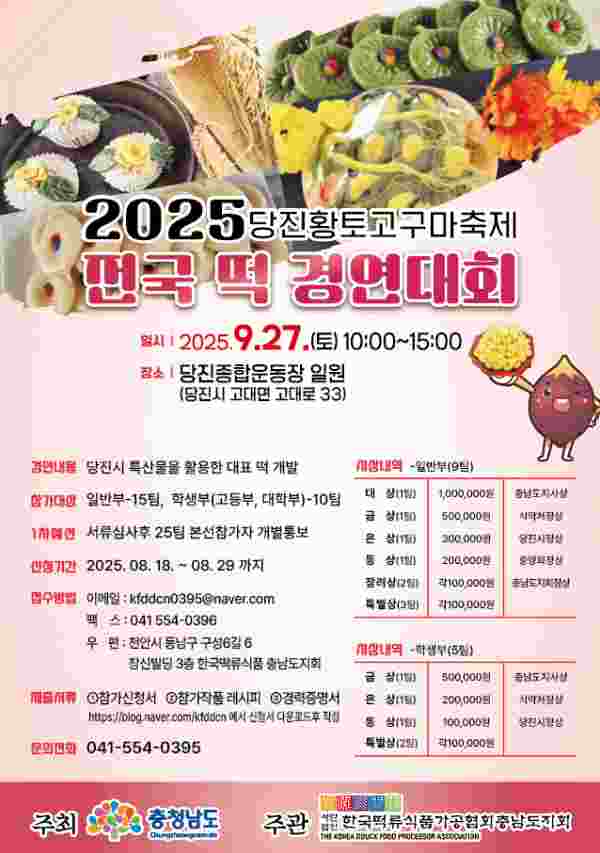 이번 대회에는 총 25개 팀이 참가해 당진의 대표 농산물인 고구마, 감자, 쌀 등 활용한 창의적인 전통 떡을 선보인다.